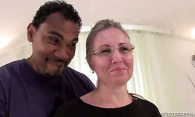 Sharp cowgirl with long hair broad opening gams while big black weenie drifts hardcore doggystyle in her shaved pussy