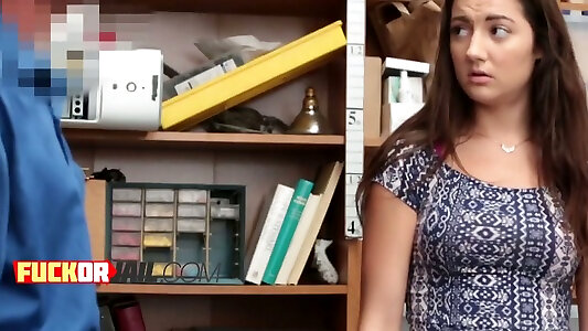 schlanker teenie-ladendieb lässt einen perversen sicherheitsmann ihren schlitz mit zunge und schwanz inspizieren, um einer verhaftung zu entgehen