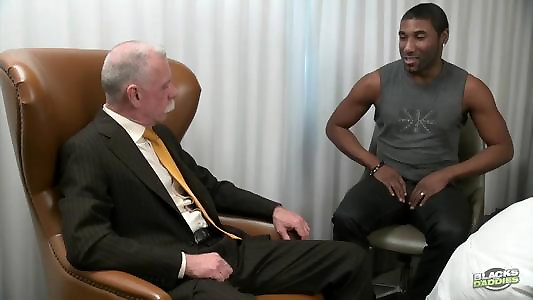 зрелый врач-гей принимает огромный стояк своего пациента темного оттенка в офисе