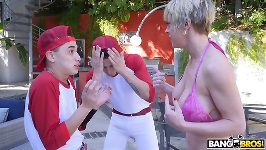 extraordinaire секс - позитивный домохозяйка ди уильямс наказывает двух молодых людей с шипящими плуг