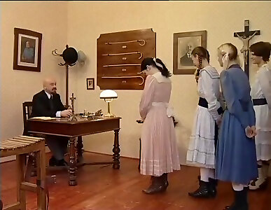 непослушная школьница получает дисциплинарную порку по заднице, стоя на коленях, от контролирующего отчима