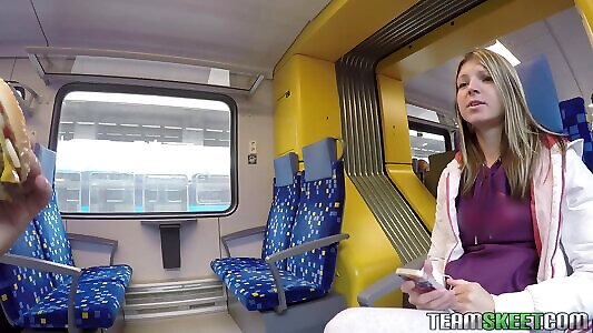 симпатичная стройная похотливая красотка ублажает случайного незнакомца минетом и горячим сексом в общественном туалете поезда