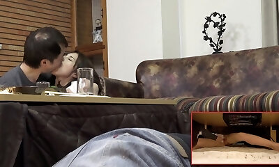 мамаша тайно вожделеет мужчину, который не является ее мужем, играя сама с собой под столом - трио