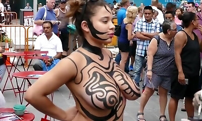 темноволосая с огромными сиськами получает свою потную киску, которую прихлебывают и сверлят на публике