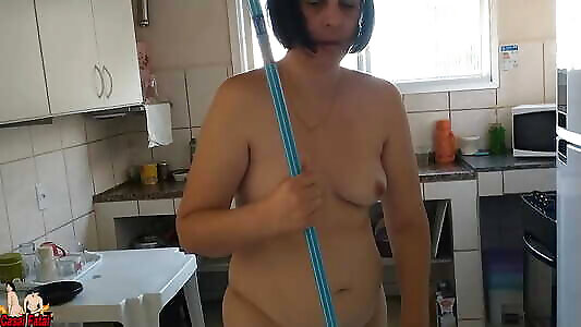 打扫完房子后,裸体主义者的妻子撒尿,她把戴绿帽子当作卫生纸