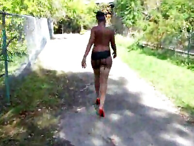 曲线优美的深色女友光着胸在公园里散步